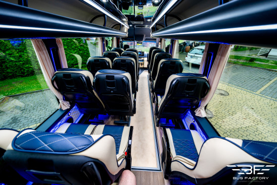 Mercedes Benz Sprinter 519 XXL in der Version „Luxury Line” in einer Konfiguration mit 20+1 Sitzen. Eine reichhaltige Innenausstattung, moderne Lösungen und zertifizierte Systeme garantieren Ihren Kunden eine sichere und komfortable Reise.