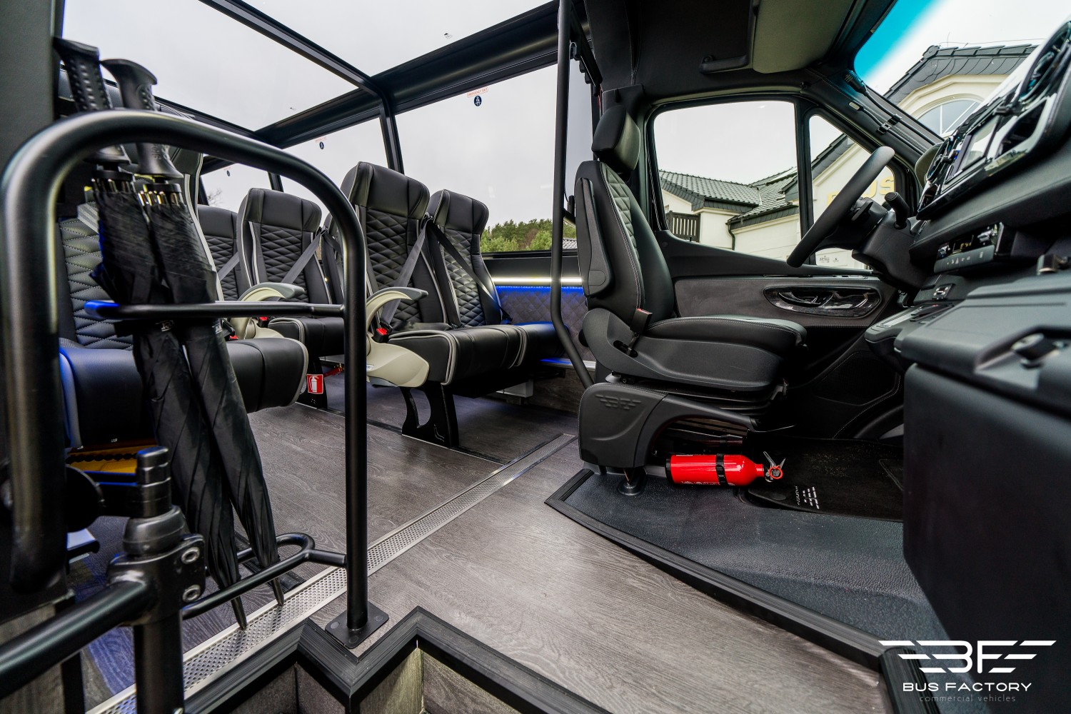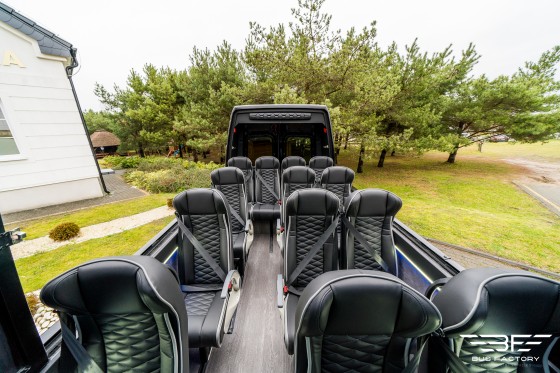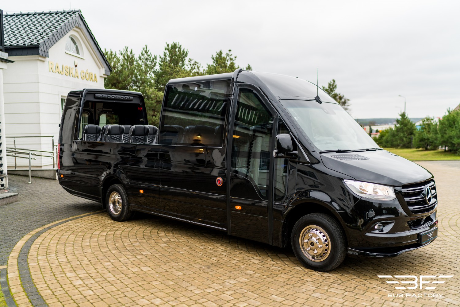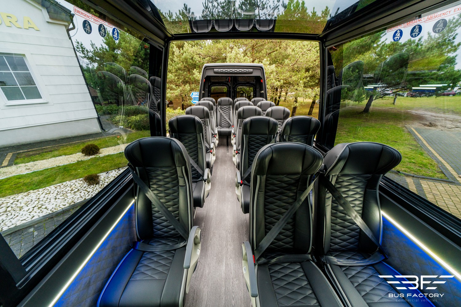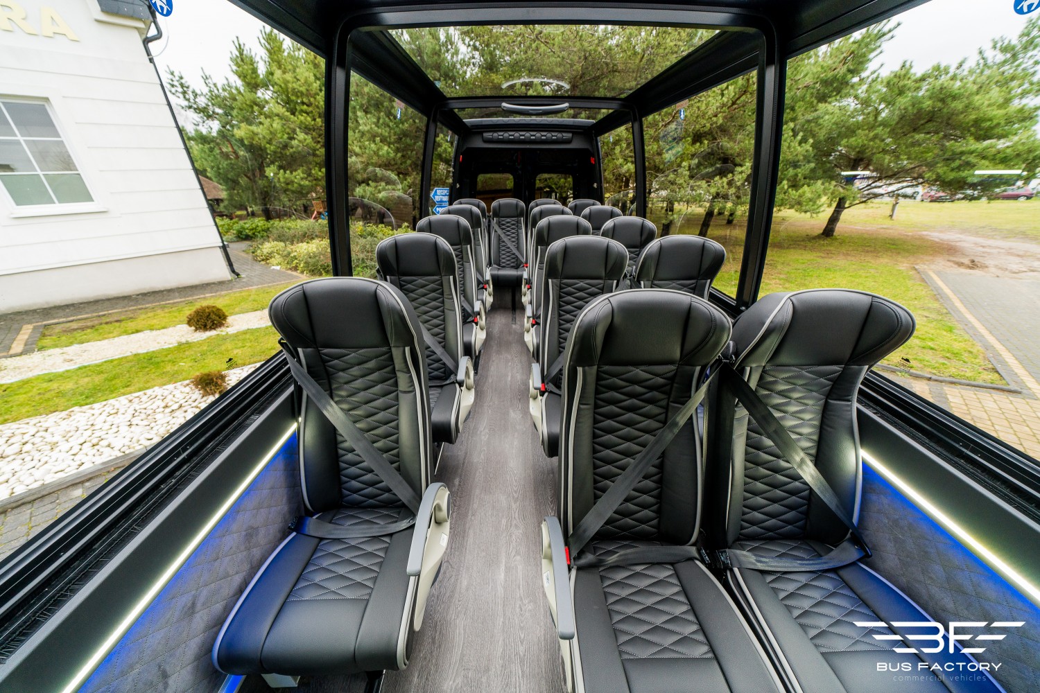 Mercedes-Benz Sprinter 519 XXL w wersji „Cabrio” w układzie siedzeń 16+1. Bogate wyposażenie wnętrza, nowoczesne rozwiązania oraz atestowane systemy gwarantują Państwa Klientom bezpieczną i komfortową podróż.
